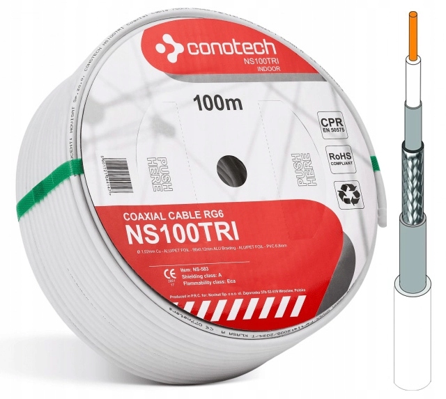 Wysokiej jakości kabel koncentryczny RG6 NS100TRI to sprawdzone rozwiązanie do instalacji telewizyjnych i satelitarnych. Dzięki potrójnemu ekranowaniu w standardzie Trishield oraz klasie ekranowania A zapewnia stabilny przesył sygnału i dobrą ochronę przed zakłóceniami.