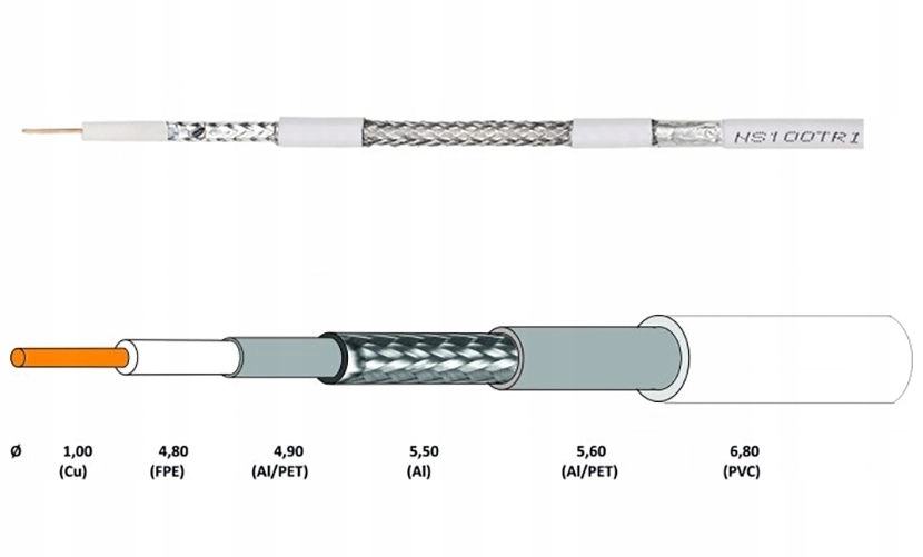 Dielektryk wykonany z fizycznie spienianego polietylenu (FPE) zapewnia bardzo dobre właściwości izolacyjne. Potrójne ekranowanie (folia AL/PET + oplot 80% + folia AL/PET) skutecznie ogranicza wpływ zakłóceń zewnętrznych.