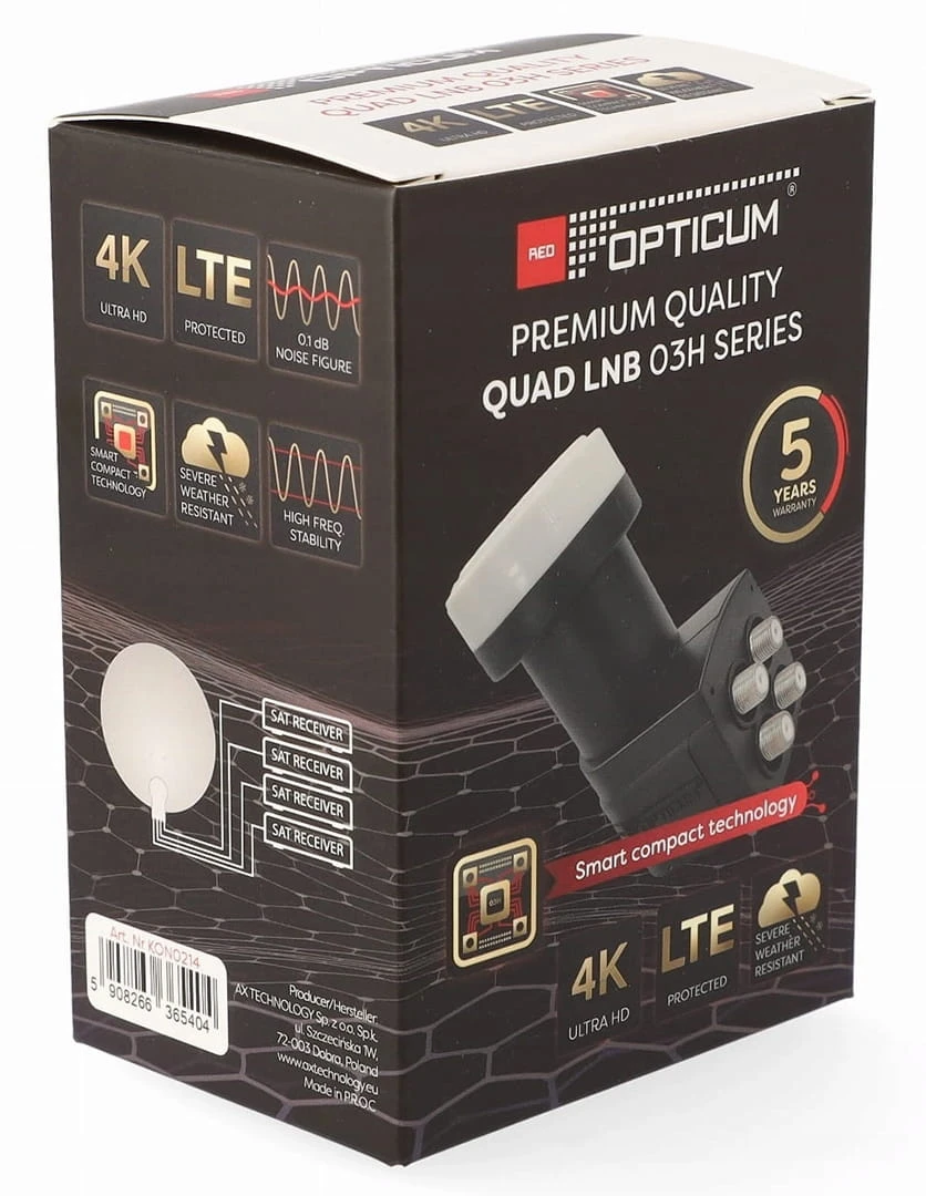 Konwerter należy do klasy premium i charakteryzuje się bardzo niskim współczynnikiem szumów 0,1 dB, co przekłada się na stabilny odbiór i dobrą jakość obrazu. Bez problemu obsługuje sygnał HD, zapewniając płynne działanie instalacji satelitarnej.