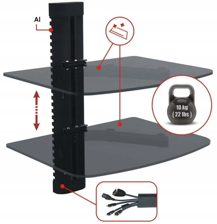 Półki wykonane są z hartowanego szkła o grubości 5 mm, które cechuje się wysoką odpornością na uszkodzenia. Stabilny stelaż z metalu i aluminium gwarantuje bezpieczeństwo użytkowania, a maksymalne obciążenie do 10 kg zapewnia bezpieczne przechowywanie sprzętu elektronicznego.