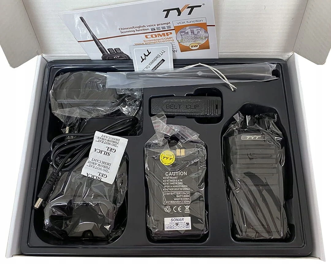 W zestawie: radiotelefon, antena, akumulator 1800 mAh, ładowarka, stacja dokująca, klips do paska, pasek na rękę, instrukcja PL