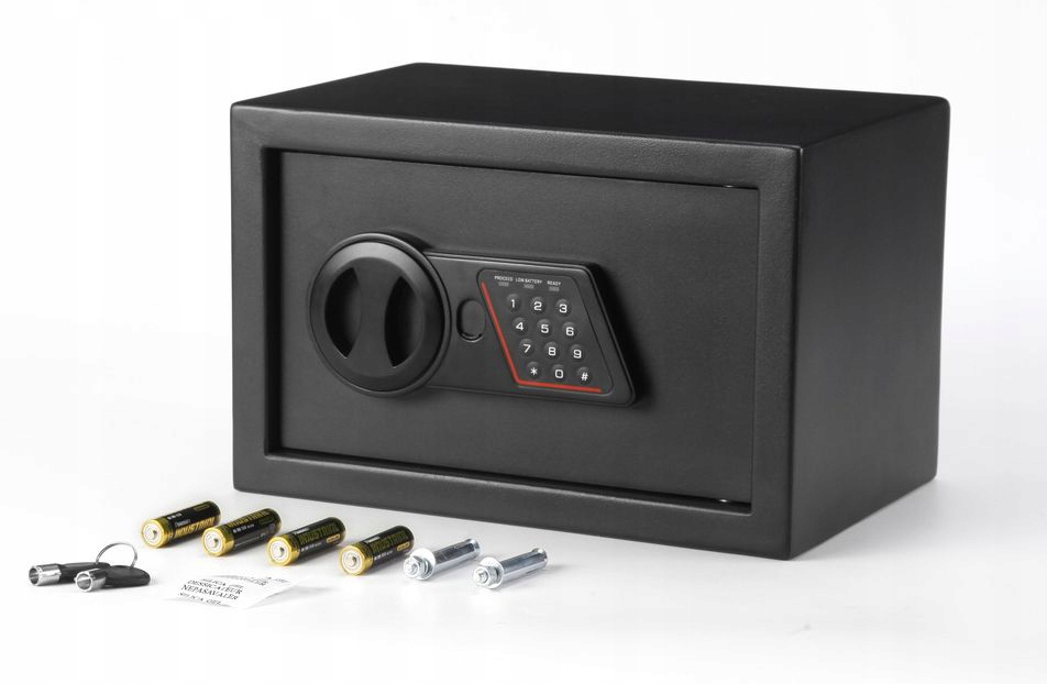 Sejf wyposażony jest w elektroniczny zamek szyfrowy z możliwością ustawienia kodu od 3 do 8 cyfr. System umożliwia wielokrotne programowanie kodu oraz blokuje klawiaturę po trzech błędnych próbach. Dodatkowo urządzenie informuje o poprawnym lub błędnym wpisaniu kodu oraz niskim poziomie baterii za pomocą sygnałów świetlnych i dźwiękowych. W razie potrzeby możliwe jest także awaryjne otwarcie kluczem.